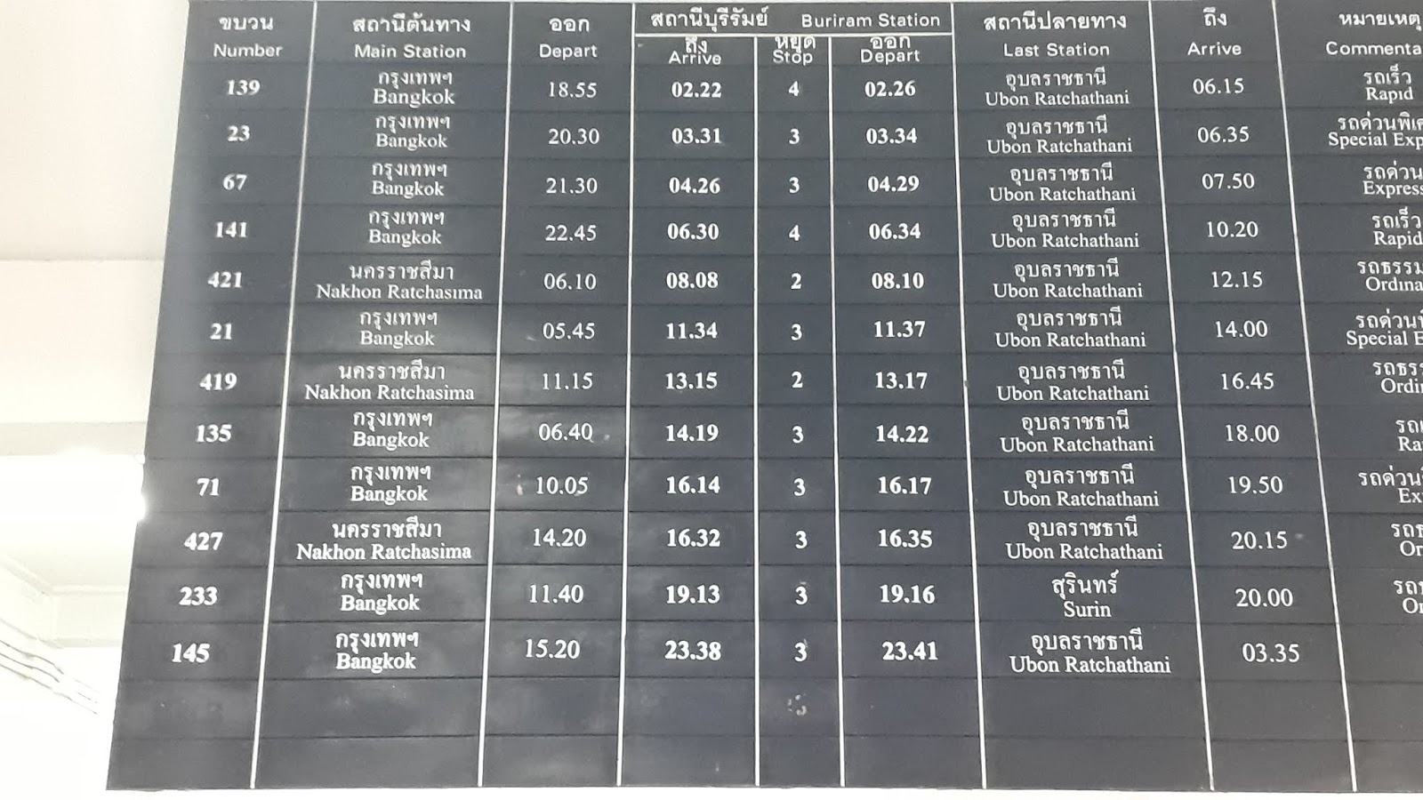 Setau saya tiket ke bangkok dari buriram ada di jual dengan ekonomi atau bisa dan sleeper train alias kereta tidur.harga ekonomi sekitar 220 baht non AC,sedangkan sleeper seharga 880 baht.karna saya tdak pernah naik kereta sleeper saya pengen mencoba bagaimana naik kereta sleeper.Perjalan dari buriram ke Bangkok di tempuh dengan tempo 6 jam kurang lebihnya.INFO wa 08970421979